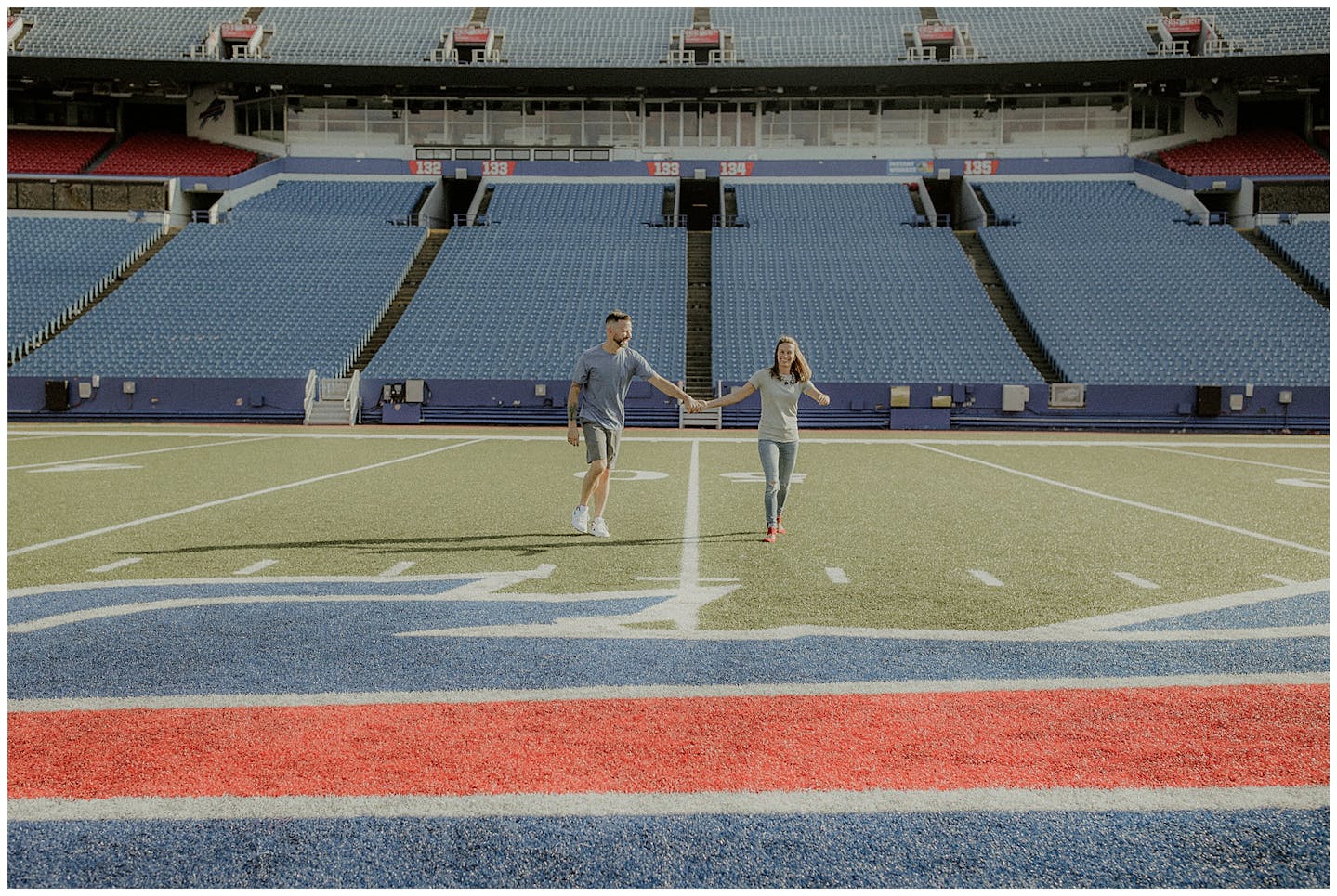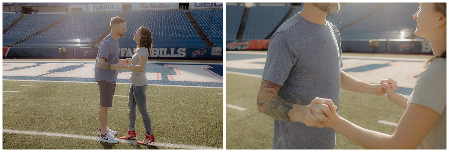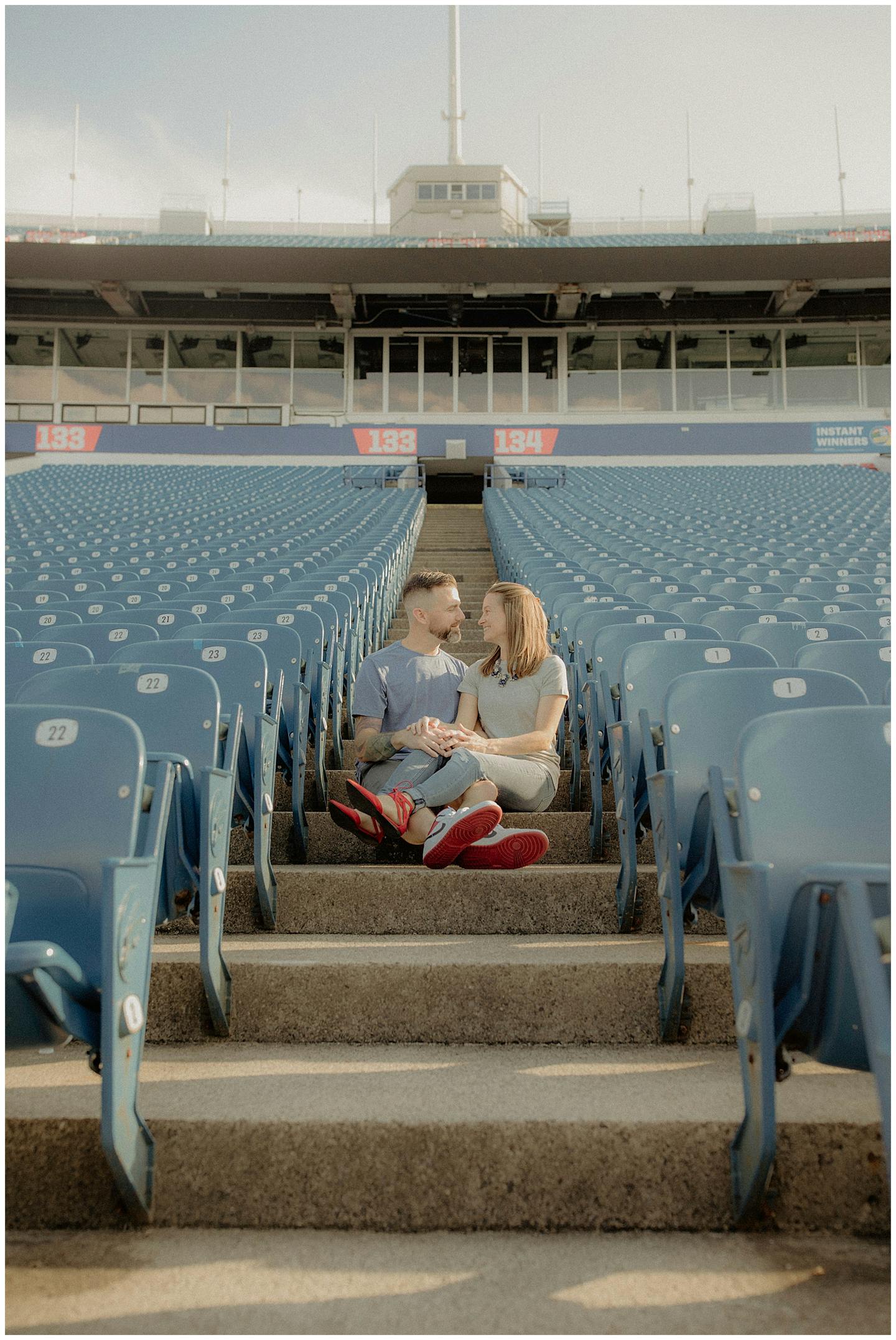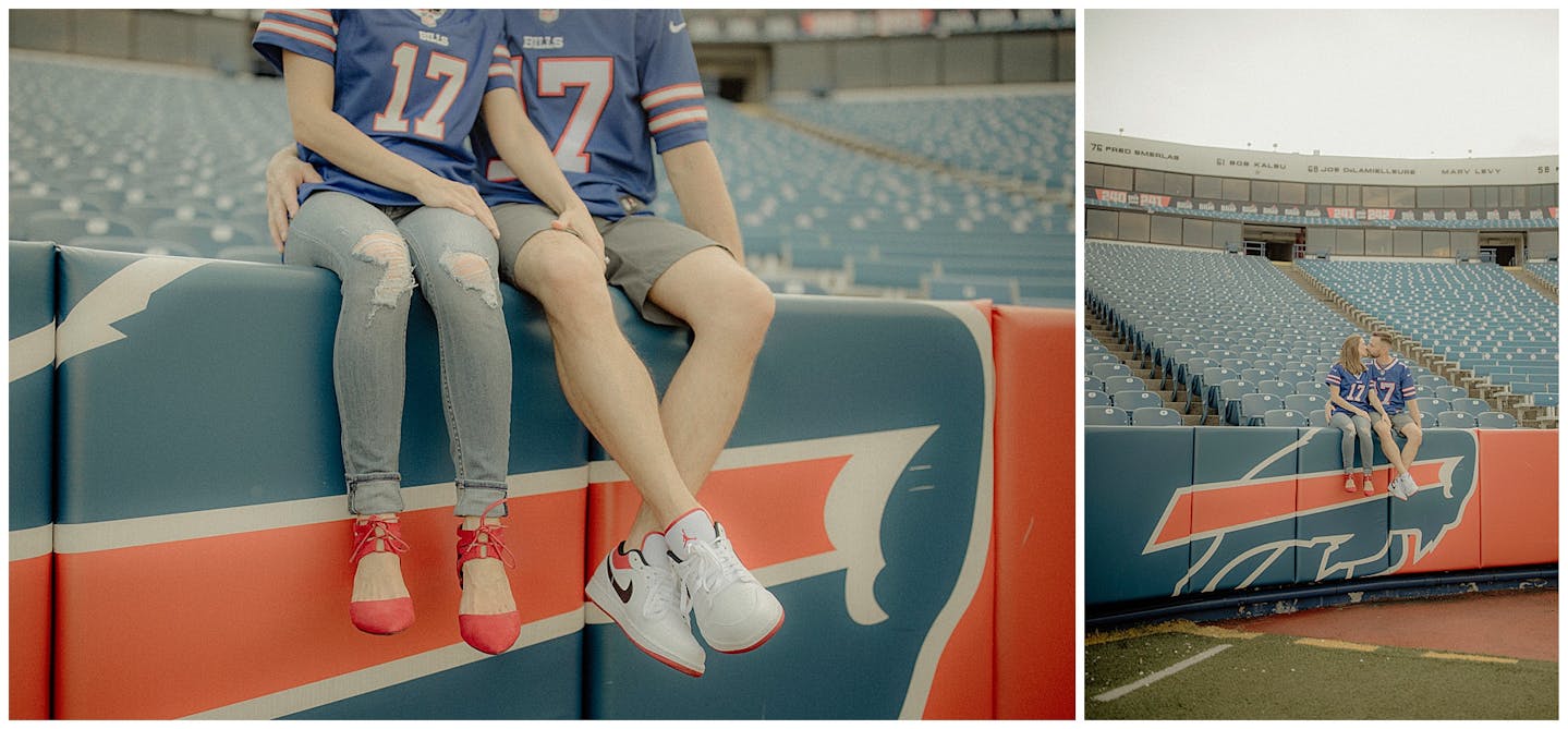 I have to say this session was a first for all of us. Jenna and I went back and forth on what to do for her and fiancé Adam's engagement session. They both wanted something unique and memorable. After a few emails back and forth, Jenna mentioned how cool it would be to do their session at Highmark Stadium where the Buffalo Bills play (for anyone reading this who may be unfamiliar with Western New York). Jenna reached out to the parties that be and scheduled a private hour for their photos.