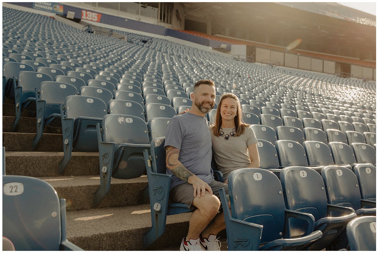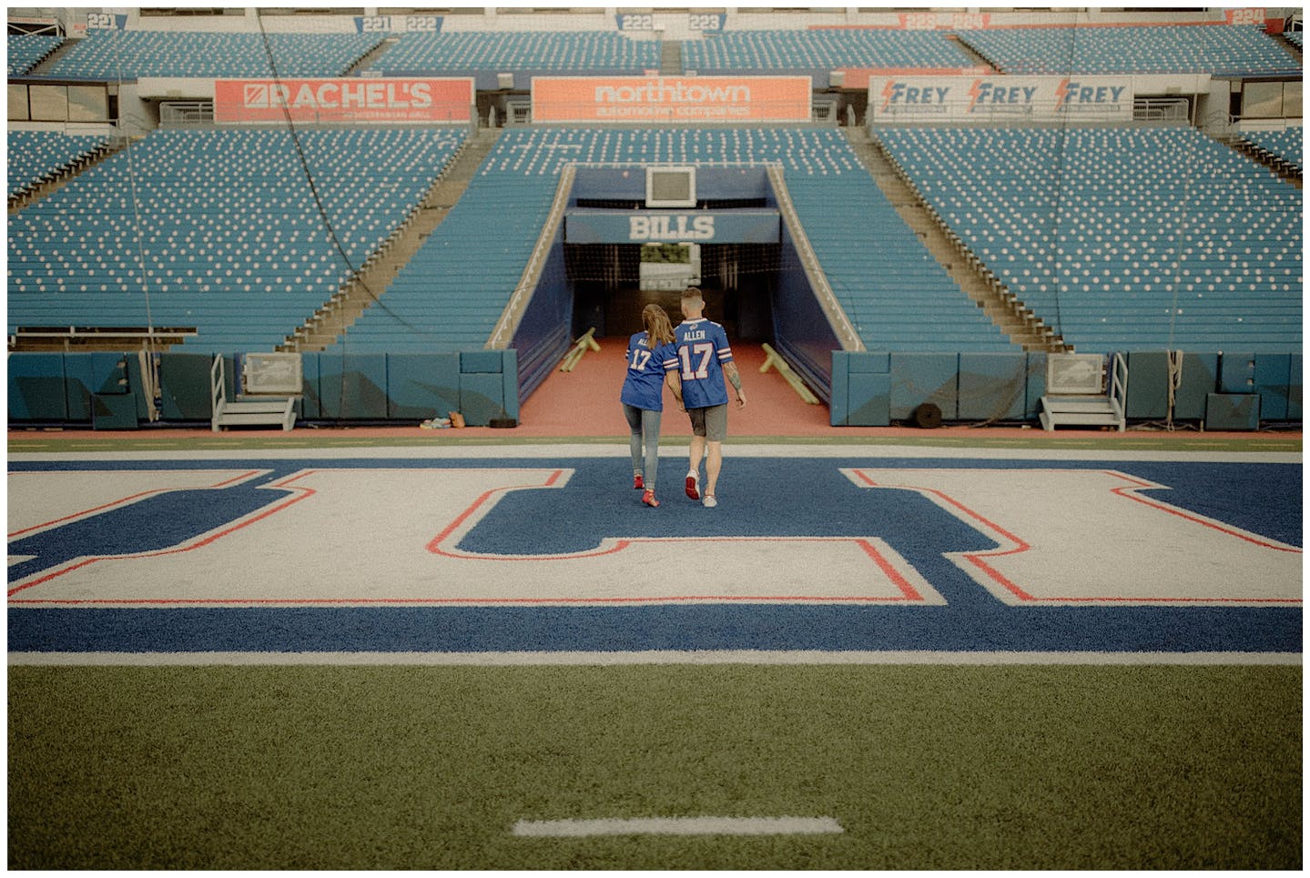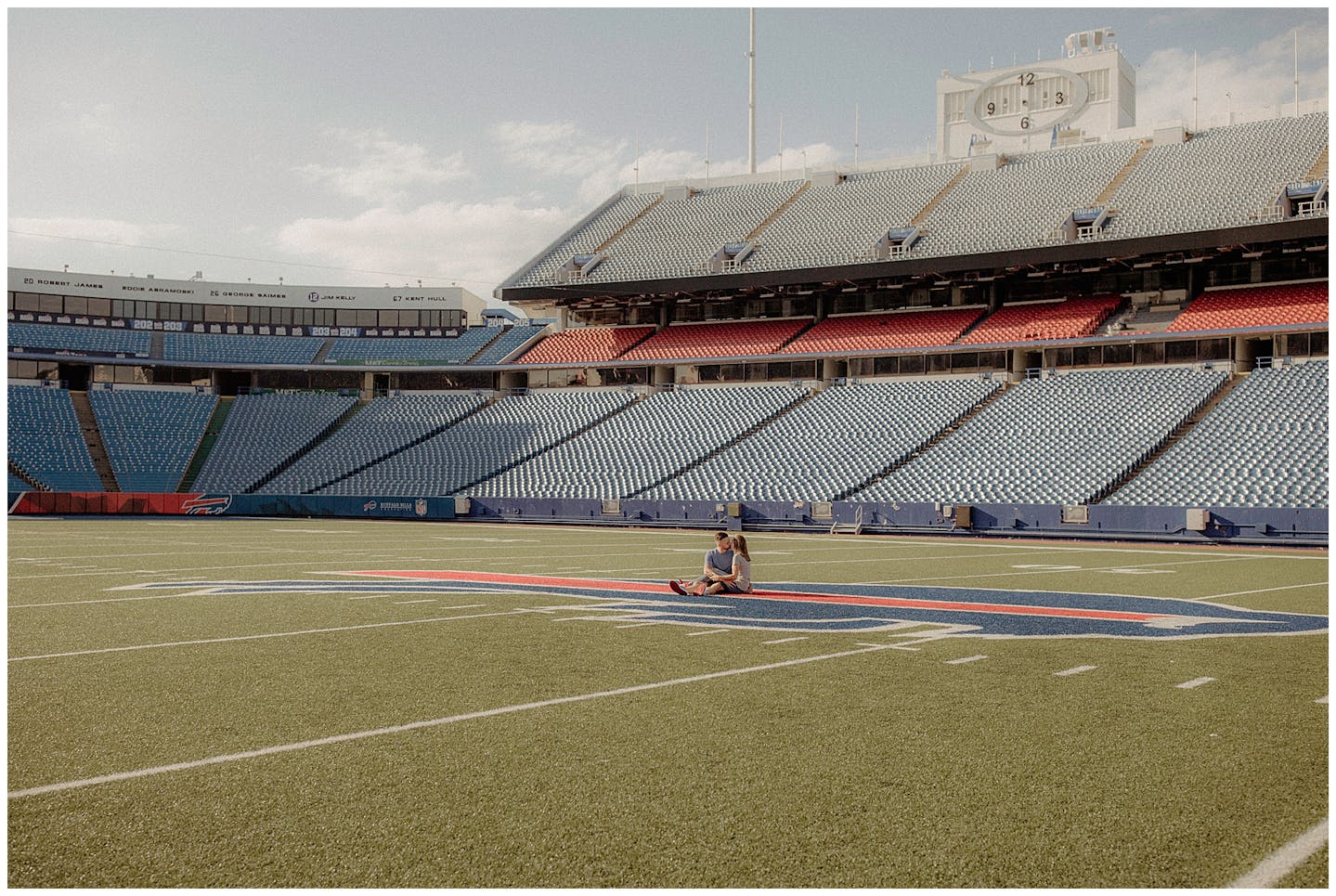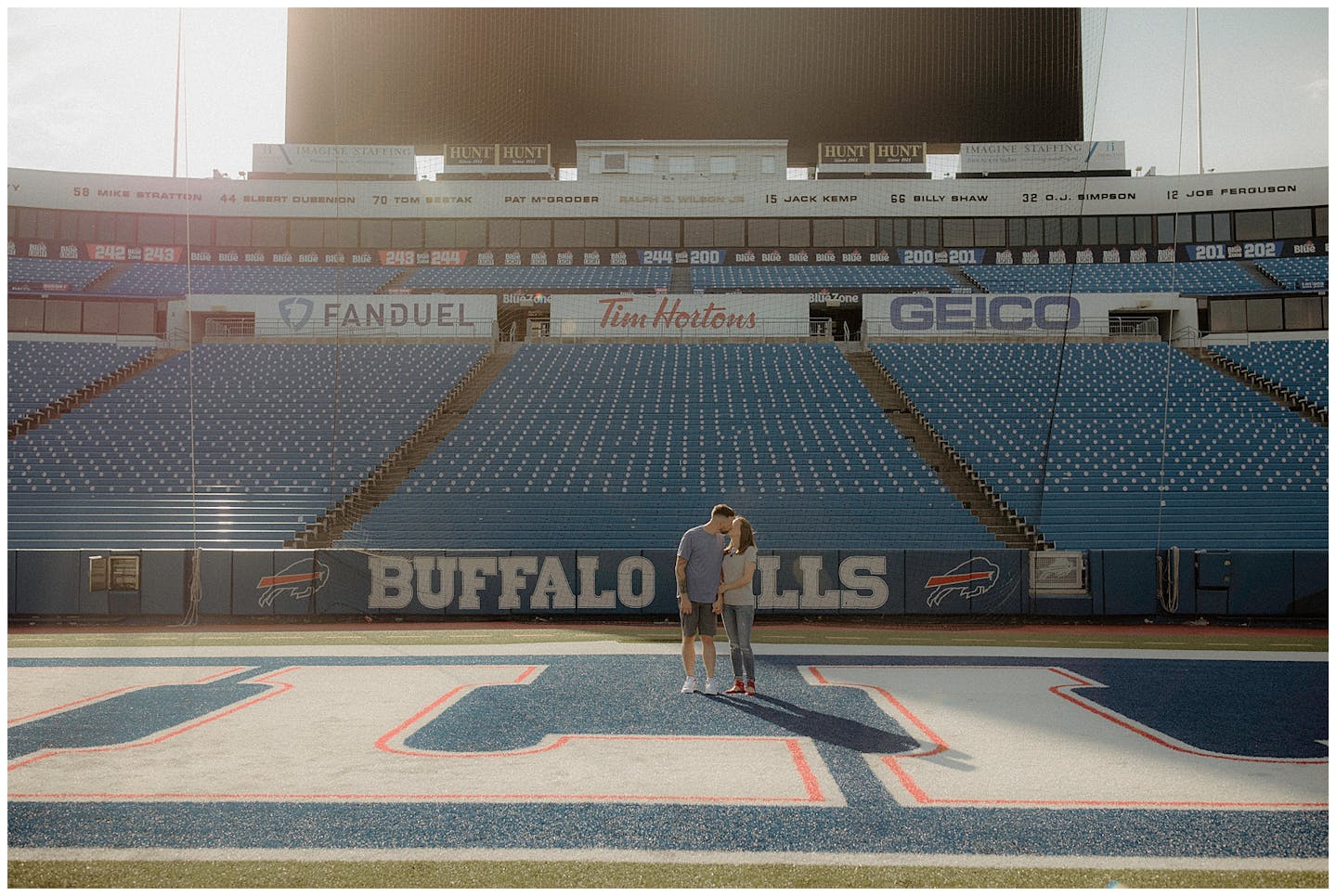 I have to say this session was a first for all of us. Jenna and I went back and forth on what to do for her and fiancé Adam's engagement session. They both wanted something unique and memorable. After a few emails back and forth, Jenna mentioned how cool it would be to do their session at Highmark Stadium where the Buffalo Bills play (for anyone reading this who may be unfamiliar with Western New York). Jenna reached out to the parties that be and scheduled a private hour for their photos.
